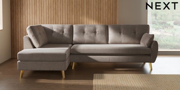 7.3.1 Buy Wilson Buttoned Back Large Corner Chaise - Left Hand Boucle Chenille Light Natural Metal Tapered - Gold from the Seasons online shop Click here to use our website with more accessibility support, for example screen readers