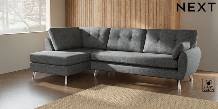 7.3.1 Buy Wilson Buttoned Back Large Corner Chaise - Left Hand Chunky Boucle Easy Clean Mid Grey Metal Tapered - Chrome from the Seasons online shop Click here to use our website with more accessibility support, for example screen readers