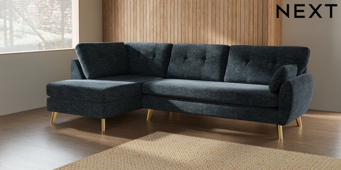 7.3.1 Buy Wilson Buttoned Back Large Corner Chaise - Left Hand Chunky Chenille Dark Navy Blue Metal Tapered - Gold from the Seasons online shop Click here to use our website with more accessibility support, for example screen readers