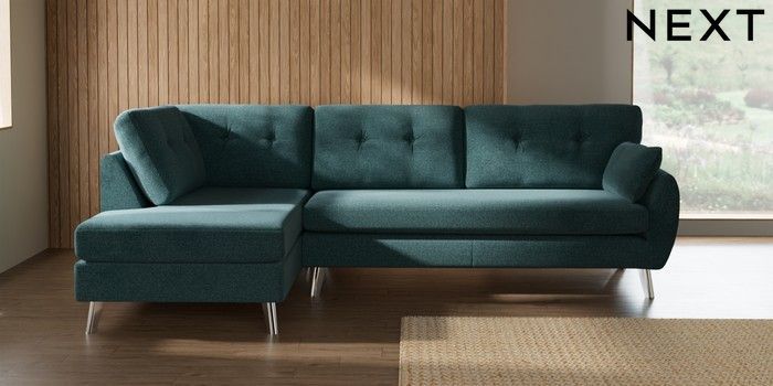7.3.1 Buy Wilson Buttoned Back Large Corner Chaise - Left Hand Chunky Chenille Mid Teal Green Metal Tapered - Chrome from the Seasons online shop Click here to use our website with more accessibility support, for example screen readers