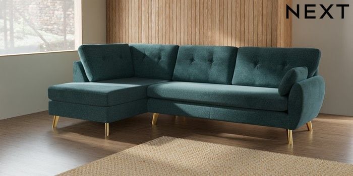 7.3.1 Buy Wilson Buttoned Back Large Corner Chaise - Left Hand Chunky Chenille Mid Teal Green Metal Tapered - Gold from the Seasons online shop Click here to use our website with more accessibility support, for example screen readers