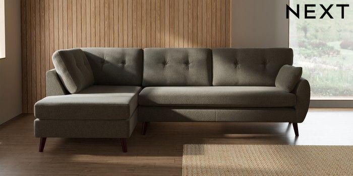 7.3.1 Buy Wilson Buttoned Back Large Corner Chaise - Left Hand Chunky Marl Light Olive Green Retro Tapered - Dark Brown from the Seasons online shop Click here to use our website with more accessibility support, for example screen readers