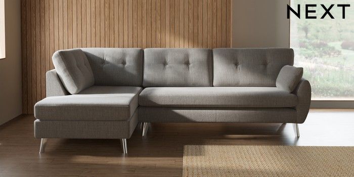 7.3.1 Buy Wilson Buttoned Back Large Corner Chaise - Left Hand Chunky Weave Dove Grey Metal Tapered - Chrome from the Seasons online shop Click here to use our website with more accessibility support, for example screen readers