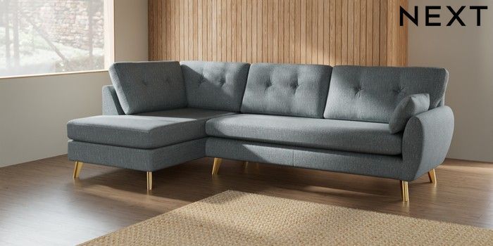7.3.1 Buy Wilson Buttoned Back Large Corner Chaise - Left Hand Chunky Weave Mid Blue Metal Tapered - Gold from the Seasons online shop Click here to use our website with more accessibility support, for example screen readers