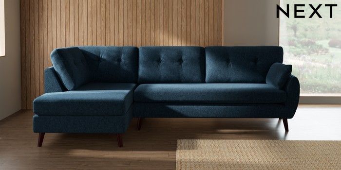 7.3.1 Buy Wilson Buttoned Back Large Corner Chaise - Left Hand Cotswold Chenille Dark Blue Retro Tapered - Dark Brown from the Seasons online shop Click here to use our website with more accessibility support, for example screen readers