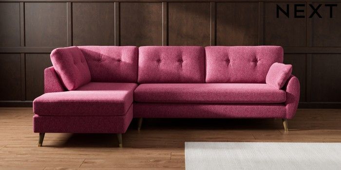 7.3.1 Buy Wilson Buttoned Back Large Corner Chaise - Left Hand Cotswold Chenille Dark Raspberry Pink Low Retro Tapered Metal Cap - Mid from the Seasons online shop Click here to use our website with more accessibility support, for example screen readers