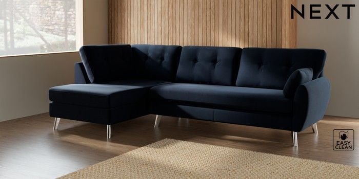 7.3.1 Buy Wilson Buttoned Back Large Corner Chaise - Left Hand Fine Chenille Easy Clean Dark Navy Blue Metal Tapered - Chrome from the Seasons online shop Click here to use our website with more accessibility support, for example screen readers