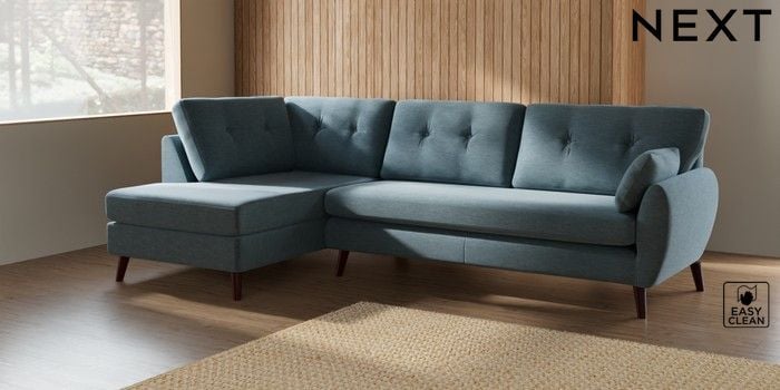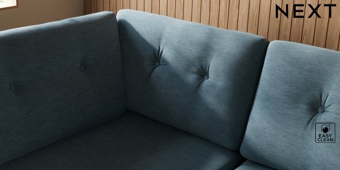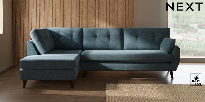 7.3.1 Buy Wilson Buttoned Back Large Corner Chaise - Left Hand Fine Chenille Easy Clean Mid Blue Retro Tapered - Dark Brown from the Seasons online shop Click here to use our website with more accessibility support, for example screen readers
