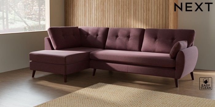 7.3.1 Buy Wilson Buttoned Back Large Corner Chaise - Left Hand Fine Chenille Easy Clean Mid Mulberry Purple Retro Tapered - Dark Brown from the Seasons online shop Click here to use our website with more accessibility support, for example screen readers