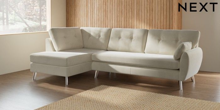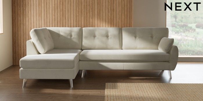 7.3.1 Buy Wilson Buttoned Back Large Corner Chaise - Left Hand Luxe Chenille Oyster Metal Tapered - Chrome from the Seasons online shop Click here to use our website with more accessibility support, for example screen readers