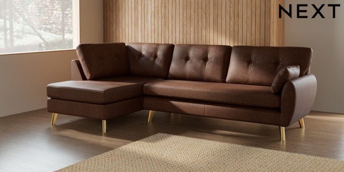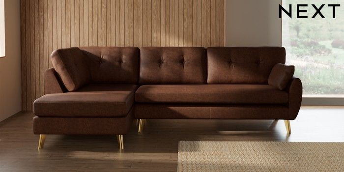 7.3.1 Buy Wilson Buttoned Back Large Corner Chaise - Left Hand Monza Faux Leather Easy Clean Chestnut Brown Metal Tapered - Gold from the Seasons online shop