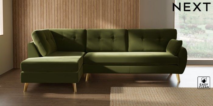7.3.1 Buy Wilson Buttoned Back Large Corner Chaise - Left Hand Plush Velvet Easy Clean Mid Olive Green Metal Tapered - Gold from the Seasons online shop