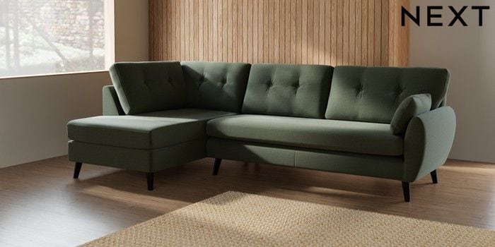 7.3.1 Buy Wilson Buttoned Back Large Corner Chaise - Left Hand Relaxed Linen Look Dark Green Retro Tapered - Dark from the Seasons online shop Click here to use our website with more accessibility support, for example screen readers