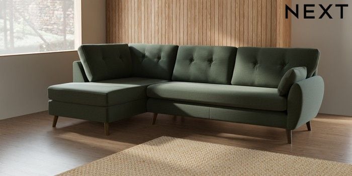 7.3.1 Buy Wilson Buttoned Back Large Corner Chaise - Left Hand Relaxed Linen Look Dark Green Retro Tapered - Mid from the Seasons online shop Click here to use our website with more accessibility support, for example screen readers