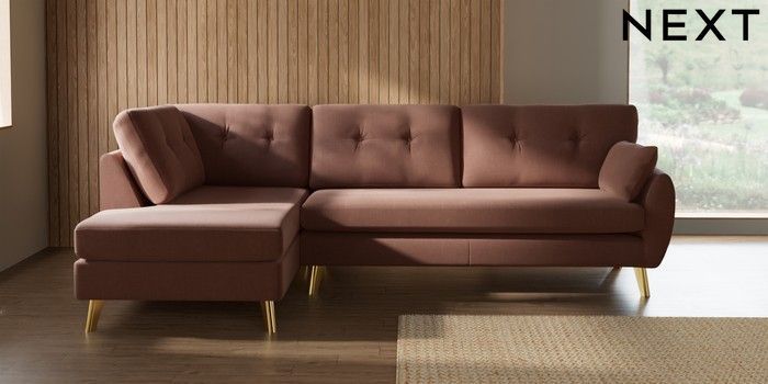 7.3.1 Buy Wilson Buttoned Back Large Corner Chaise - Left Hand Relaxed Linen Look Light Rust Brown Metal Tapered - Gold from the Seasons online shop Click here to use our website with more accessibility support, for example screen readers