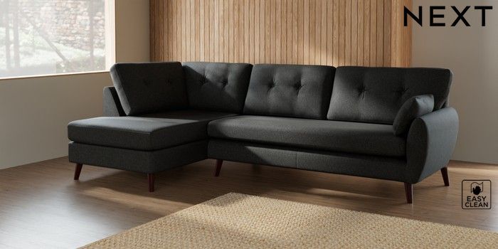 7.3.1 Buy Wilson Buttoned Back Large Corner Chaise - Left Hand Tweedy Blend Easy Clean Charcoal Grey Retro Tapered - Dark Brown from the Seasons online shop Click here to use our website with more accessibility support, for example screen readers