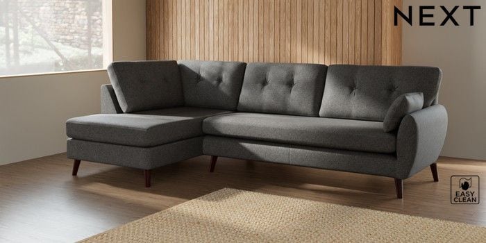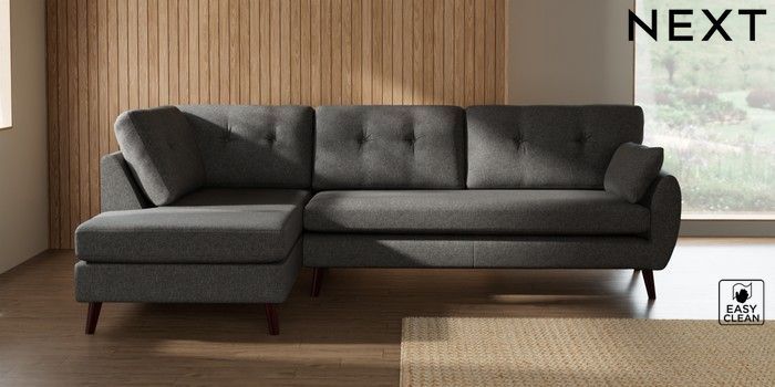 7.3.1 Buy Wilson Buttoned Back Large Corner Chaise - Left Hand Tweedy Blend Easy Clean Dark Grey Retro Tapered - Dark Brown from the Seasons online shop Click here to use our website with more accessibility support, for example screen readers