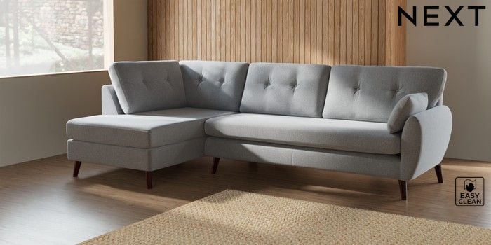 7.3.1 Buy Wilson Buttoned Back Large Corner Chaise - Left Hand Tweedy Blend Easy Clean Light Silver Grey Retro Tapered - Dark Brown from the Seasons online shop Click here to use our website with more accessibility support, for example screen readers