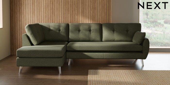 7.3.1 Buy Wilson Buttoned Back Large Corner Chaise - Left Hand Tweedy Chenille Mid Moss Green Metal Tapered - Chrome from the Seasons online shop Click here to use our website with more accessibility support, for example screen readers