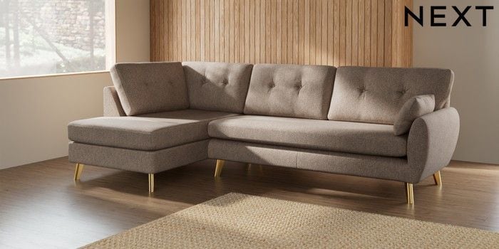 7.3.1 Buy Wilson Buttoned Back Large Corner Chaise - Left Hand Tweedy Chenille Mid Natural Metal Tapered - Gold from the Seasons online shop Click here to use our website with more accessibility support, for example screen readers