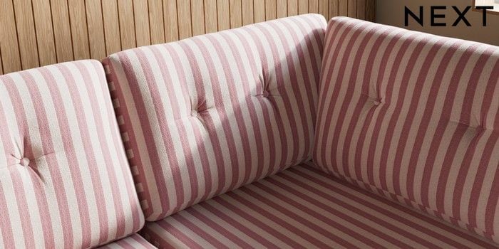 7.3.1 Buy Wilson Buttoned Back Large Corner Chaise - Right Hand Bold Chenille Stripe Dark Pink Retro Tapered - Dark Brown from the Seasons online shop Click here to use our website with more accessibility support, for example screen readers