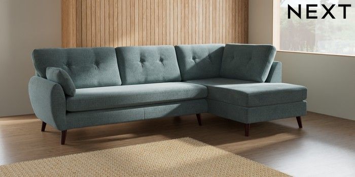7.3.1 Buy Wilson Buttoned Back Large Corner Chaise - Right Hand Chunky Chenille Light Teal Green Retro Tapered - Dark Brown from the Seasons online shop Click here to use our website with more accessibility support, for example screen readers