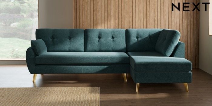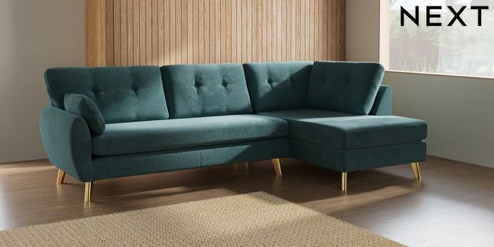 7.3.1 Buy Wilson Buttoned Back Large Corner Chaise - Right Hand Chunky Chenille Mid Teal Green Metal Tapered - Gold from the Seasons online shop Click here to use our website with more accessibility support, for example screen readers