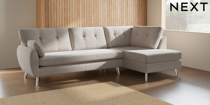 7.3.1 Buy Wilson Buttoned Back Large Corner Chaise - Right Hand Chunky Chenille Oyster Metal Tapered - Chrome from the Seasons online shop Click here to use our website with more accessibility support, for example screen readers