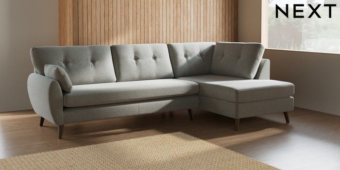 7.2.10 Buy Wilson Buttoned Back Large Corner Chaise - Right Hand Chunky Texture Dove Retro Tapered - Mid from the Seasons online shop Click here to use our website with more accessibility support, for example screen readers