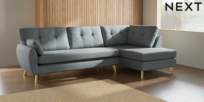 7.3.1 Buy Wilson Buttoned Back Large Corner Chaise - Right Hand Chunky Weave Mid Blue Metal Tapered - Gold from the Seasons online shop Click here to use our website with more accessibility support, for example screen readers
