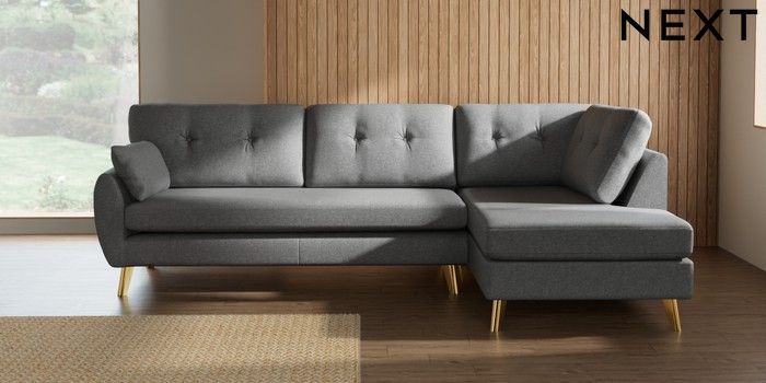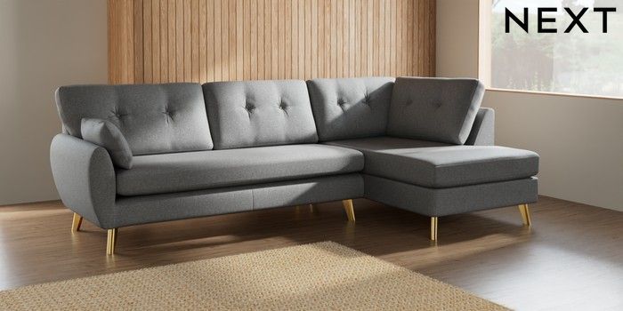 7.3.1 Buy Wilson Buttoned Back Large Corner Chaise - Right Hand Chunky Weave Mid Grey Metal Tapered - Gold from the Seasons online shop Click here to use our website with more accessibility support, for example screen readers