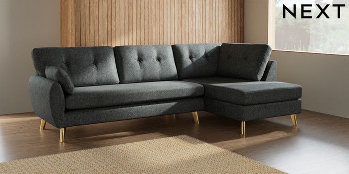 7.3.1 Buy Wilson Buttoned Back Large Corner Chaise - Right Hand Cotswold Chenille Dark Grey Metal Tapered - Gold from the Seasons online shop Click here to use our website with more accessibility support, for example screen readers