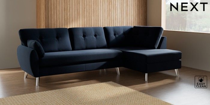 7.3.1 Buy Wilson Buttoned Back Large Corner Chaise - Right Hand Fine Chenille Easy Clean Dark Navy Blue Metal Tapered - Chrome from the Seasons online shop Click here to use our website with more accessibility support, for example screen readers