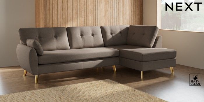 7.3.1 Buy Wilson Buttoned Back Large Corner Chaise - Right Hand Fine Chenille Easy Clean Mid Taupe Brown Metal Tapered - Gold from the Seasons online shop