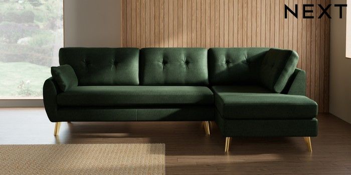 7.3.1 Buy Wilson Buttoned Back Large Corner Chaise - Right Hand Luxe Chenille Dark Green Metal Tapered - Gold from the Seasons online shop Click here to use our website with more accessibility support, for example screen readers