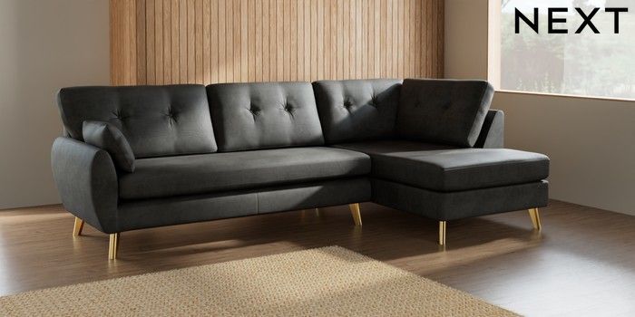 7.3.1 Buy Wilson Buttoned Back Large Corner Chaise - Right Hand Monza Faux Leather Easy Clean Dark Grey Metal Tapered - Gold from the Seasons online shop