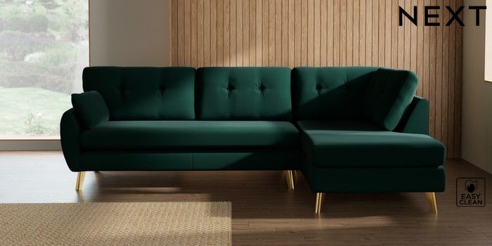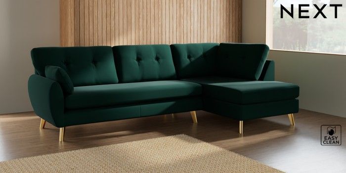 7.3.1 Buy Wilson Buttoned Back Large Corner Chaise - Right Hand Plush Velvet Easy Clean Bottle Green Metal Tapered - Gold from the Seasons online shop
