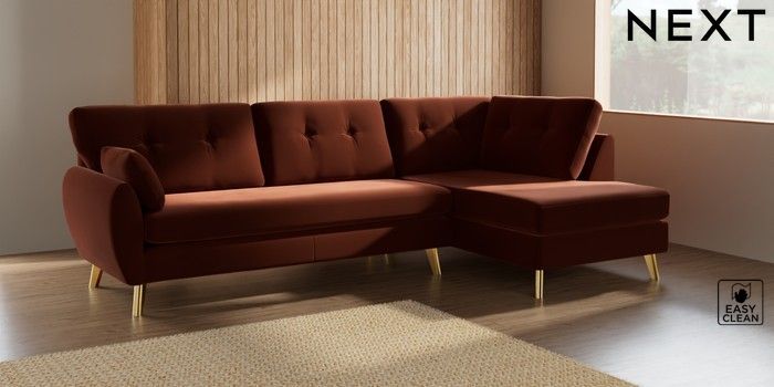 7.3.1 Buy Wilson Buttoned Back Large Corner Chaise - Right Hand Plush Velvet Easy Clean Ginger Orange Metal Tapered - Gold from the Seasons online shop