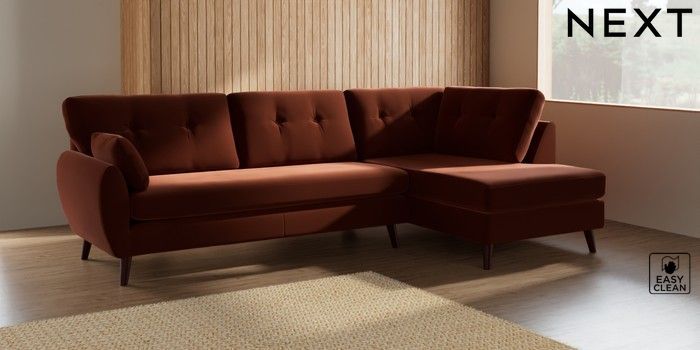 7.3.1 Buy Wilson Buttoned Back Large Corner Chaise - Right Hand Plush Velvet Easy Clean Ginger Orange Retro Tapered - Dark Brown from the Seasons online shop Click here to use our website with more accessibility support, for example screen readers