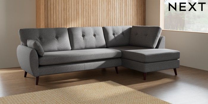 7.2.10 Buy Wilson Buttoned Back Large Corner Chaise - Right Hand Studio Chenille Mid Grey Retro Tapered - Dark Brown from the Seasons online shop Click here to use our website with more accessibility support, for example screen readers