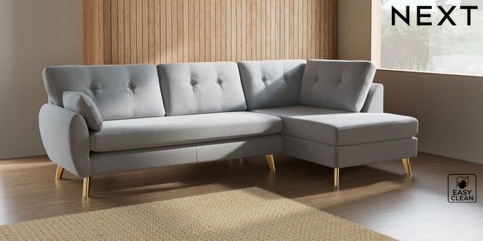 7.3.1 Buy Wilson Buttoned Back Large Corner Chaise - Right Hand Tweedy Blend Easy Clean Light Silver Grey Metal Tapered - Gold from the Seasons online shop Click here to use our website with more accessibility support, for example screen readers