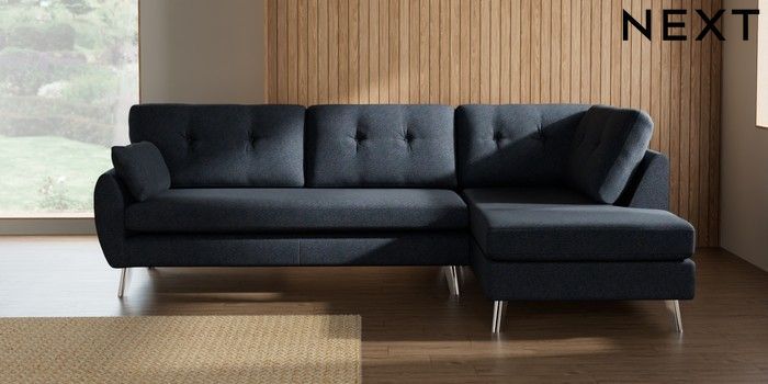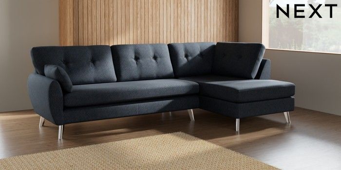 7.3.1 Buy Wilson Buttoned Back Large Corner Chaise - Right Hand Tweedy Chenille Navy Blue Metal Tapered - Chrome from the Seasons online shop Click here to use our website with more accessibility support, for example screen readers