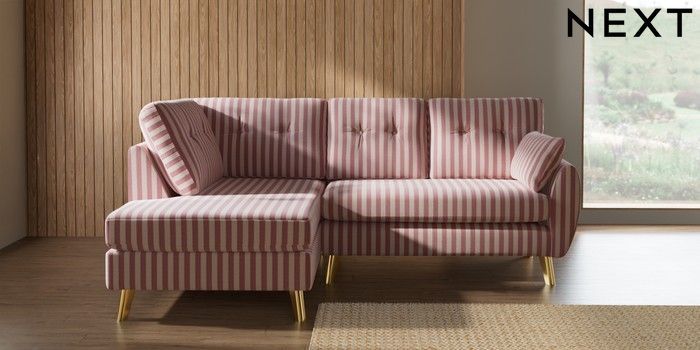 7.3.1 Buy Wilson Buttoned Back Medium Corner Chaise - Left Hand Bold Chenille Stripe Dark Pink Metal Tapered - Gold from the Seasons online shop Click here to use our website with more accessibility support, for example screen readers