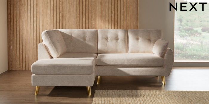 7.3.1 Buy Wilson Buttoned Back Medium Corner Chaise - Left Hand Boucle Chenille Oyster Metal Tapered - Gold from the Seasons online shop Click here to use our website with more accessibility support, for example screen readers