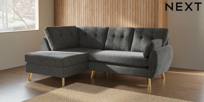 7.3.1 Buy Wilson Buttoned Back Medium Corner Chaise - Left Hand Chunky Chenille Dark Grey Metal Tapered - Gold from the Seasons online shop Click here to use our website with more accessibility support, for example screen readers