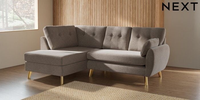 7.3.1 Buy Wilson Buttoned Back Medium Corner Chaise - Left Hand Chunky Chenille Light Dove Metal Tapered - Gold from the Seasons online shop Click here to use our website with more accessibility support, for example screen readers
