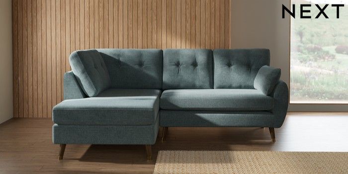 7.3.1 Buy Wilson Buttoned Back Medium Corner Chaise - Left Hand Chunky Chenille Light Teal Green Low Retro Tapered Metal Cap - Mid from the Seasons online shop Click here to use our website with more accessibility support, for example screen readers