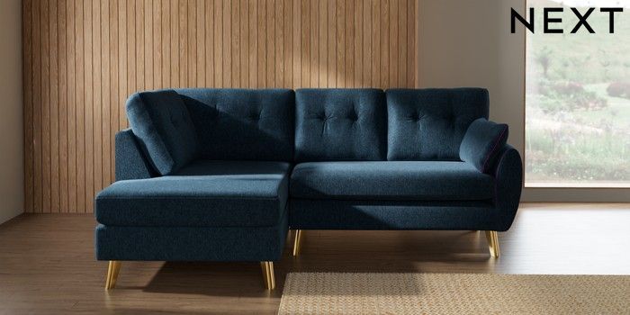 7.3.1 Buy Wilson Buttoned Back Medium Corner Chaise - Left Hand Cotswold Chenille Dark Blue Metal Tapered - Gold from the Seasons online shop Click here to use our website with more accessibility support, for example screen readers