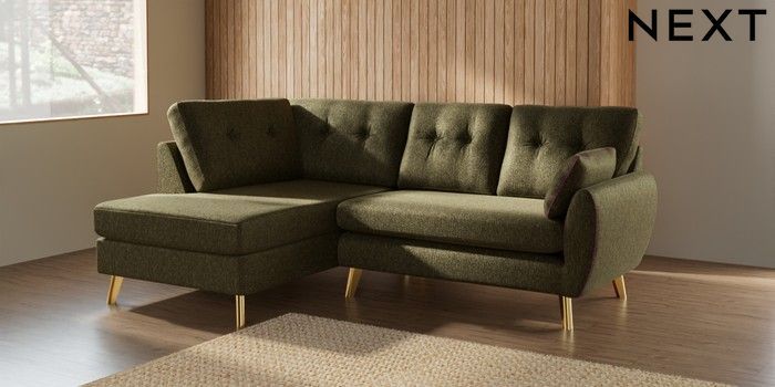 7.3.1 Buy Wilson Buttoned Back Medium Corner Chaise - Left Hand Cotswold Chenille Dark Green Metal Tapered - Gold from the Seasons online shop Click here to use our website with more accessibility support, for example screen readers