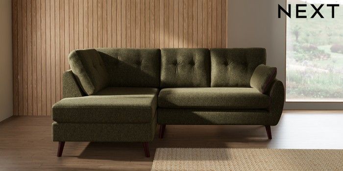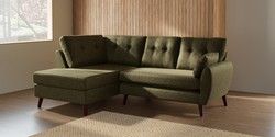 7.3.1 Buy Wilson Buttoned Back Medium Corner Chaise - Left Hand Cotswold Chenille Dark Green Retro Tapered - Dark Brown from the Seasons online shop Click here to use our website with more accessibility support, for example screen readers
